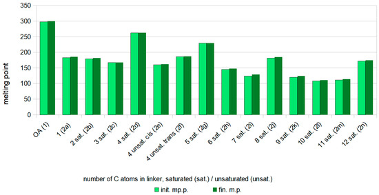 The dependency between the melting point of OADs 2a–2n and the amount of carbon atoms in the linker joining two triterpene moieties. Legend: OA—oleanolic acid (reference compound); sat.—saturated linker; unsat.—unsaturated linker; init. m.p.—initial melting point; fin. m.p.—final melting point.
