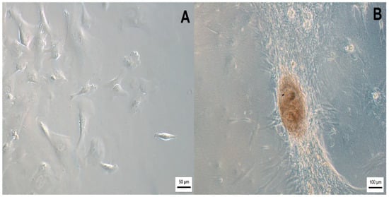 (A) WJ-MSCs; (B) Neurosphere after 14 days of neural precursors in culture. The images were obtained via optical microscopy (Carl Zeiss Microscopy, Zeiss, Jena, Germany).