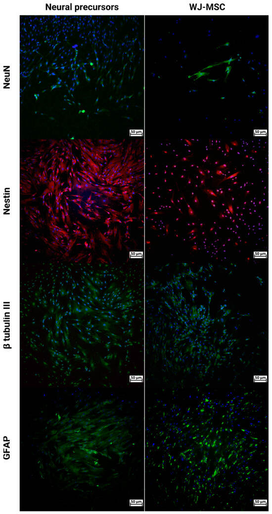 An immunocytochemistry assay was performed with WJ-MSCs and neural precursors (Figure 3). In both cases, cells expressed glial fibrillary acidic protein (GFAP), β-tubulin III, Nestin, and neuronal nuclear protein (NeuN).