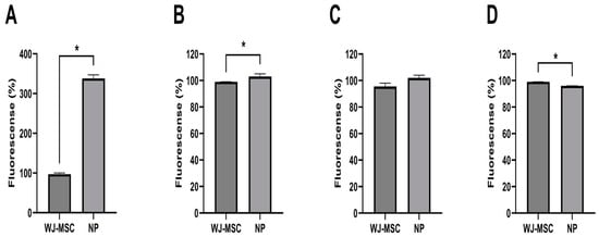 Quantitative data regarding the analysis using the non-parametric Mann–Whitney test of the expression in the NPs and WJ-MSCs for NeuN, Nestin, and GFAP markers by immunocytochemistry demonstrated that there was a more significant statistical difference in neural precursors than WJ-MSCs (Figure 4).