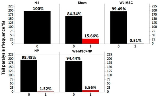 For 24 days, all the animals were analyzed by clinical manifestation and weight. The alteration “paralysis of tail” was considered as “absent” or “present,” resulting in a set of binary data (zero when absent; one when present). Thus, the data analysis revealed that the highest presence of a clinical manifestation was found in the Sham group (15.66%), followed by the WJ-MSC + NP group (5.56%), NP group (1.52%), and, lastly, the WJ-MSC group (0.51%) (Figure 5).
