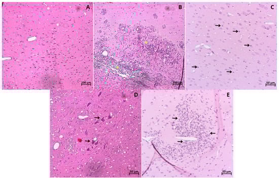 The brain tissue collected post-euthanasia was used for histopathological analyses. H&E-stained slides were examined for findings including perivascular leukocyte infiltration, leukocytes within the parenchyma, microglial activation, astrocyte activation, and cell death, as observed through the visualization of pyknotic neurons (Supplementary Figure S3). In the non-induced animals, the tissue stained with H&E exhibited a homogeneous distribution of neurons and myelin (Figure 6).