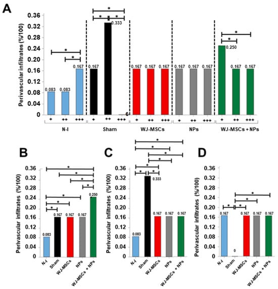 Histopathological analysis of the finding “Perivascular leukocytic infiltrates.” (A) Intragroup analysis of the categories “mild (+)”, “moderate (++)”, and “severe (+++)” (n = 8). (B) Between-group analysis for the “mild (+)” category; (C) between-group analysis for the “moderate (++)” category; (D) between-group analysis for the “severe (+++)” category. Results from Pearson’s Chi-squared test, considering p > 0.05 as statistically significant at the 95% confidence interval (*). Non-induced group (N-I), Wharton’s jelly mesenchymal stem cells (WJ-MSCs), and neural precursors (NPs).