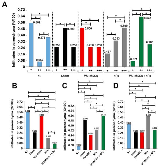 However, the WJ-MSCs and NPs groups showed reduced incidence compared to the control (Figure 8C). The NPs group displayed increased values for severe infiltrates compared to all other groups (Figure 7D).
