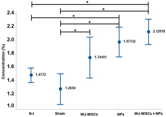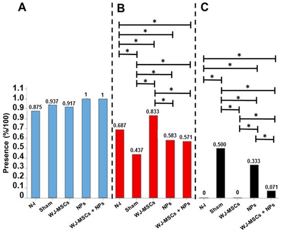 Using the predictive binary logistic regression analysis, it was observed that the animals that received MSCs, NPs, and MSC + NPs showed a statistically significant difference concerning the Sham group, with p > 0.05 for all the analyses, thus rejecting the null hypothesis. The relationships of MSCs v NPs and MSCs vs. MSCs + NPs also showed a statistically significant difference, with p = 0.902 > 0.05 and p = 0.809 > 0.05, respectively. The NPs vs. MSCs + NPs showed no statistical difference, with p = 0.034 < 0.05, not rejecting the null hypothesis (Supplementary Graphics SG1–SG3).