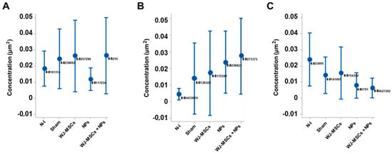Cytokine concentration per square micrometer. (A) IL-4 concentration in the different analyzed groups, with no statistical difference (n = 8); (B) IFN-γ concentration among the groups, with no statistical difference (n = 8); (C) TNF-α concentration in the different groups, without statistically significant difference (n = 8). The results are from ANOVA analysis with Tukey’s post-test, displayed as mean ± standard error, and with p < 0.05. Non-induced group (N-I), Wharton’s jelly mesenchymal stem cells (WJ-MSCs), and neural precursors (NPs).