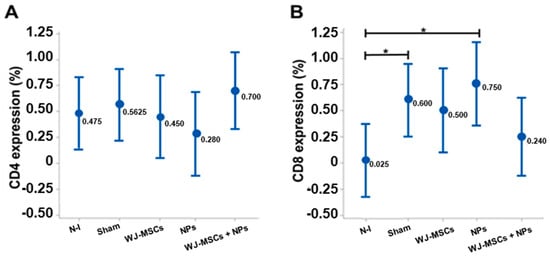 Lymphocytic markers in brain tissue. (A) Comparative quantification of CD4 cells between groups with no statistical difference (n = 8). (B) Comparative quantification of CD8 cells between groups (n = 8). Sham and NP groups had an increase in CD8 cells compared to the non-induced group. The results are from ANOVA analysis with Tukey’s post-test, displayed as mean ± standard error, and with p < 0.05 (*). Non-induced group (N-I), Wharton’s jelly mesenchymal stem cells (WJ-MSCs), and neural precursors (NPs).