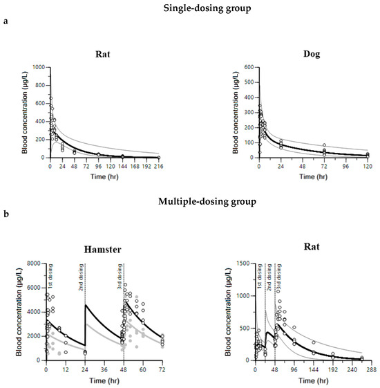 The pharmacokinetics of pyronaridine were evaluated in hamsters, rats, and dogs. Because a high blood-to-plasma ratio (4.9–17.8) and distribution to red blood cells have been reported for pyronaridine, whole blood was selected as the matrix for bioanalytical quantification [38]. The PK profile of pyronaridine for each species is shown in Figure S1. The corresponding estimated PK parameters from NCA for each species are summarized in Table S1. In rats, 60 mg/kg of pyronaridine tetraphosphate was orally administered once or once a day for three days. From the single-dosing group (Figure S1a, left), the Vss/F and CL/F were estimated to be 125.02 ± 21.63 L/kg and 2.79 ± 0.21 L/h/kg in rats. The Tmax, t1/2, and MRT were estimated to be 3.83 ± 3.43, 37.43 ± 6.61, and 45.01 ± 8.60 h, respectively. In dogs, 90 mg of pyronaridine tetraphosphate was orally administered once (Figure S1a, right). The Vss/F and CL/F were estimated to be 28.40 ± 5.55 L/kg and 0.64 ± 0.13 L/h/kg. The Tmax, t1/2, and MRT were estimated to be 1.67 ± 1.09, 38.44 ± 7.06, and 46.19 ± 11.47 h.