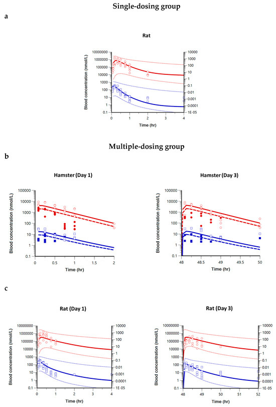 The standard deviation could not be calculated in hamsters since naïve-pooled analysis (pooling sparse data from several individuals) was used to evaluate PKs. In the multiple-dosing group (180 mg/kg or 360 mg/kg for three days) in hamsters (Figure S1b, left), the t1/2 and MRT were estimated to be 14.05–13.97 h and 20.27–20.15 h for the low-to-high dose group, respectively. The accumulation index was calculated to be 2.37 for the low-dose group and 1.66 for the high-dose group in hamsters. The Vss/F and CL/F were estimated to be 36.38–48.66 L/kg and 1.80–2.41 L/h/kg for the low-to-high dose group. In the multiple-dosing group (60 mg/kg for three days) in rats (Figure S1b, right), the t1/2 and MRT were estimated to be 42.27 ± 2.99 h and 60.99 ± 4.31 h. The Vss/F and CL/F were estimated to be 141.30 ± 18.66 L/kg and 2.33 ± 0.36 L/h/kg. The accumulation index was calculated to be 3.04 ± 0.45 in rats.