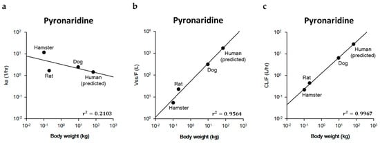 The PK parameters estimated by the model fitting in hamsters, rats, and dogs were used for the inter-species extrapolation to predict human parameters of pyronaridine. The ka of 11.62 h−1 (hamster), 1.67 h−1 (rat), and 2.46 h−1 (dog) was used for inter-species scaling. For the extrapolation, the units of Vss/F and CL/F were modified from L/kg to L and from L/h/kg to L/h, respectively, using the actual body weight of animals. The Vss/F in hamsters, rats, and dogs were calculated to be 5.44, 22.57, and 311.18 L, respectively. The CL/F in hamsters, rats, and dogs were estimated to be 0.22, 0.45, and 6.48 L/h, respectively. The body weights of hamsters, rats, and dogs used for allometric scaling were 0.10, 0.21, and 9.52 kg, respectively. The exponents, coefficients, and correlation coefficients for ka, Vss/F, and CL/F were estimated using the equation for simple allometric scaling. The human PK parameters were predicted using a simple allometric equation. The predicted parameters were 1.44 h−1 for ka, 1721.75 L (=24.60 L/kg) for Vss/F, and 28.25 L/h (=0.40 L/h/kg) for CL/F in a 70 kg human. The coefficient of determination (r2) was estimated to be 0.2103 for ka, 0.9564 for Vss/F, and 0.9967 for CL/F, respectively. The relationship between the PK parameters and body weights across the species is shown in Figure 3.