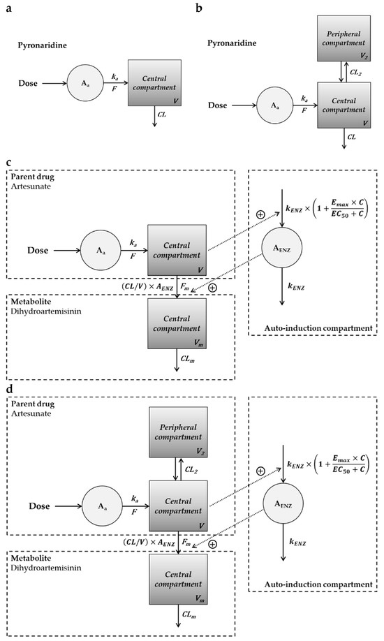 Compartment PK modeling was performed in three species (hamster, rat, and dog) to describe the time course of pyronaridine, artesunate, and dihydroartemisinin blood concentrations. The hamster PK data were collected from the literature we previously published [37]. The observed PK data in three species were fitted to a one- or two-compartment PK model using WinNonlin software (version 8.4, Certara™, Princeton, NJ, USA). The PK data were fitted using nonlinear mixed-effects (NLME) modeling with the first-order conditional estimation-extended least squares (FOCE-ELS) algorithm. The NLME model incorporated fixed effects (population parameters) and random effects (individual parameters). Also, a parent-metabolite model consisting of the one- or two-compartment PK model was developed to describe the PKs of artesunate and dihydroartemisinin. An auto-induction PK model was incorporated into the parent-metabolite model of artesunate and dihydroartemisinin since artemisinin-like drugs showed time-dependent PKs (decreasing plasma concentrations) after repeated oral administration by auto-induction metabolism [52,58]. First-order kinetics was assumed for the absorption, distribution, and elimination of pyronaridine, and a well-fitted model was chosen. The final models for pyronaridine, artesunate, and dihydroartemisinin are shown in Figure 5, and the differential equations for each model are provided in Table 3.