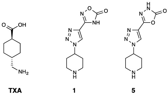 Structures of the current gold standard tranexamic acid (TXA) and the two 1,2,3-triazole derivatives discovered by Bosch-Sanz et al., which contained an oxadiazolone and a terminal piperidine ring [43]. The molecular weight of TXA is 157.21 g/mol, and for the hydrochloric salts of compounds 1 and 5, the molecular weight is 272.69 g/mol.