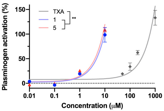 Activity of TXA and compounds 1 and 5 on the conversion of plasminogen into plasmin by tPA in the absence of fibrin. The percentage of plasminogen’s activation was determined by quantifying the increase in the enzyme’s activity relative to the activity in the absence of any compound. The concentrations at which each compound increased tPA’s activity by 50% were obtained for compound 1 (4.67 µM), compound 5 (4.03 µM), and TXA (283.01 µM). All datapoints are represented as mean ± SD. Data were fitted to a linear model and slopes were compared using an unpaired t-test with Welch’s correction. Statistically significant differences are indicated (** p < 0.01).