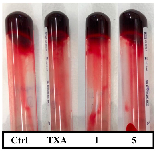 Blood clots containing the studied compounds after incubation at 37 °C for 30 min. Tubes were inverted to allow a better differentiation of clots (top) and liquid blood (bottom). In the control tube, no compound was added. TXA, 1, and 5 tubes contained 40 µM of each product, respectively.