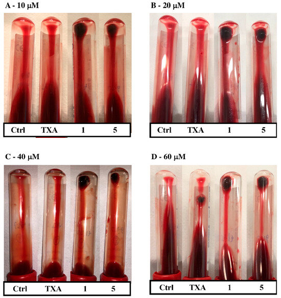Images of the antifibrinolytic activity of compounds TXA, 1, and 5 in whole blood clots. To initiate fibrinolysis, clots were treated with 10 µg/mL of tPA, and four different concentrations of each compound were tested: (A) 10 µM, (B) 20 µM, (C) 40 µM, and (D) 60 µM. Control tubes were clots to which only tPA was added. Tubes were inverted to allow a better differentiation of remaining clots (top) and liquid blood (bottom) after 24 h of incubation at 37 °C.
