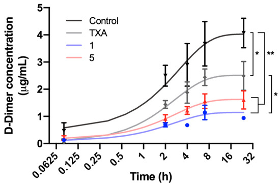 The antifibrinolytic activity of compounds 1 and 5 was also studied on whole blood by measuring the concentration of D-dimer, a specific fibrinolytic marker released in clot lysis [17]. After the addition of tPA and the two compounds or TXA on pre-formed clots, the concentration of released D-dimer was quantified and compared to a non-treated control clot (Figure 5). D-dimer levels increased in the four different conditions after tPA was added to the clots, implying that fibrinolysis had been initiated. After 24 h of incubation, a significant increase in D-dimer was detected in the control clot compared to clots containing one of the studied compounds or TXA, evidencing that the two studied compounds, as well as TXA, were effective inhibitors of clot lysis. D-dimer release at timepoint 24 h was significantly lower for compound 1 than for TXA and around 35% lower than for compound 5, and was the molecule with more antifibrinolytic potency according to this test.