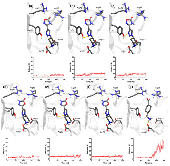 Representation of the most important distances for molecular dynamics simulations of compounds 1, 5, and TXA. Shown distances for compound 1: (a) piperidine and Asp57, (b) triazole (nitrogen N2) and Tyr72, and (c) triazole (nitrogen N3) and Tyr72. Distances for compound 5: (d) piperidine and Asp57, (e) triazole (nitrogen N2) and Tyr72, (f) triazole (nitrogen N3), and Tyr72. Distances for TXA: (g) terminal amine and Asp57.