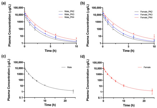 In the case of dogs, one male and one female Beagle dog were selected for the study. A period of 5 days was used to allow dogs to acclimatize, and at the start of dosing, they were between 5 and 6 months old. Dogs were housed individually per sex in an environmentally controlled room, maintained at 24 ± 2 °C and 71.5 ± 4.5% relative humidity, on a 12–12 h light–dark cycle (beginning at 06:00 h) with 17 or 22 air changes per hour. Dogs were provided with 300 g feed every day and with water ad libitum.