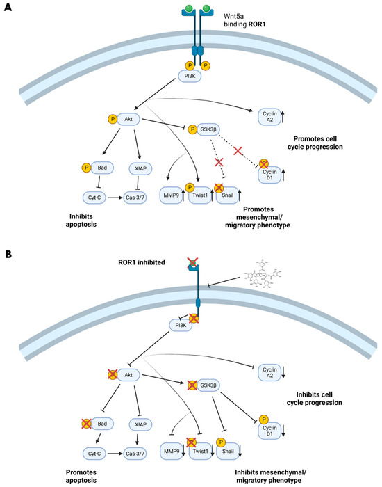 The effects of PGG on the ROR1 molecular pathway. (A) Depiction of active ROR1 and downstream signaling derived from the cited literature. Activated ROR1 leads to the phosphorylation of AKT and GSK3β. The phosphorylation of these proteins influences further downstream pro-cancerous signaling. (B) Depiction of inhibited ROR1 and downstream signaling based on the western blot experiments in PC3 cells and cited literature. PGG inhibits ROR1 and suppresses the phosphorylation of AKT and GSK3β, which causes a reduction in phospho-Bad, XIAP, MMP9, Twist1, Snail, Cyclin D1, and Cyclin A2 protein expression. The repression of these oncogenic signaling pathways promotes apoptosis and inhibits migration, invasion, and cell cycle progression in PC3 cells.