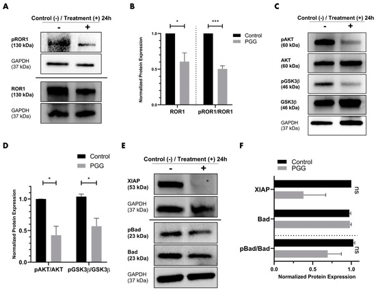 To evaluate whether PGG inhibited ROR1 in vitro, we treated PC3 cells with either vehicle or 31.25 µM of PGG for 24 h, followed by western blot analysis to assess ROR1, AKT, and GSK3β (Figure 4A,C). We opted to treat PC3 since these cells represent an aggressive and clinically difficult to treat ARneg-AI cancer that demonstrated the highest levels of ROR1 expression in comparison to normal prostatic epithelial cells and other prostate cancer cell lines such as DU145. Upon PGG treatment, we observed a reduction in phospho-ROR1 (Tyr786) and total ROR1 expression in comparison to the control (Figure 4A,B). Additionally, PC3 cells demonstrated a reduction in phospho-AKT (ser473) and phospho-GSK3β (ser9) upon treatment with PGG, as indicated by the phospho-AKT to total AKT ratio and phospho-GSK3β to total GSK3β ratio (Figure 4C,D). Because PGG inhibited phospho-AKT, we opted to evaluate whether PGG exerted an influence on phospho-B-cell lymphoma 2-associated agonist of cell death (BAD) and X-linked inhibitor of apoptosis (XIAP) as well. With PGG treatment, PC3 cells displayed a reduction in phospho-BAD (ser 136) and XIAP in comparison to the control (Figure 4E,F). Our data indicate that PGG is an inhibitor of ROR1 and can reduce the phosphorylation of its intracellular domain and overall protein expression (Figure 4B and Figure 3B). In doing so, PGG can also reduce downstream oncogenic signaling in PC3 cells, as observed by the reduction in phospho-AKT and phospho-GSK3β (Figure 4D and Figure 3B). PGG caused cytotoxicity and apoptosis in PC3 cells by reducing phospho-AKT, which inhibited downstream phospho-BAD and XIAP (Figure 4F and Figure 3B).