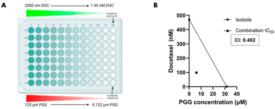 The combination of PGG and docetaxel is synergistic and lowers the IC50 of both compounds in PC3 cells. (A) Depiction of PC3 cells in a 96-well plate treated with Docetaxel and PGG. Cells were treated with the highest concentration of docetaxel and PGG and serially diluted to the lowest combo-concentration. Cell viability was compared to a control lane to assess % cell viability. (B) The isobologram is represented with a line drawn from the IC50 of docetaxel alone (y-intercept) to the IC50 of PGG alone (x-intercept). The combination IC50 is represented by the square dot and was used to calculate the CI (combination index) = 0.402. The IC50 values were obtained from cell viability experiments. For more information on IC50 values, refer to Figure S2. [N ≥ 3].