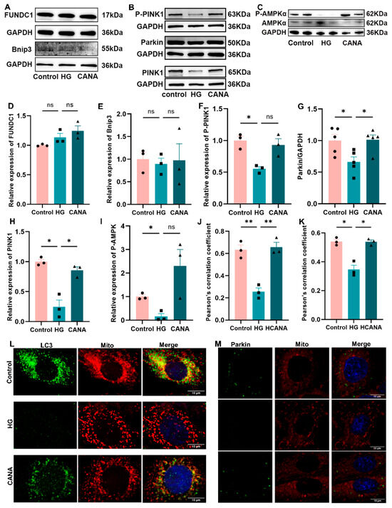 2.2. Canagliflozin Effectively Restored Impaired PINK1-Parkin-Dependent Mitophagy in High-Glucose-Treated H9C2 Cells