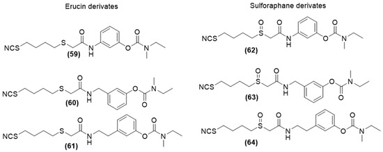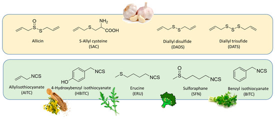 Among the natural sources, interesting candidates as H2S-donor were represented by garlic-derived organosulfur compounds, such as allicin and the polysulfides diallyl di and tri-sulfide (DADS and DATS), and isothiocyanates, such as sulforaphane (SFN), allyl isothiocyanate (AITC), benzyl isothiocyanate (BITC), 4-hydroxybenzyl isothiocyanate (HBITC), and erucin (ERU), present in many edible plants of the Brassicaceae family, like broccoli, black and white mustard, garden cress, and rocket (Figure 2).