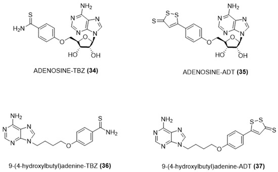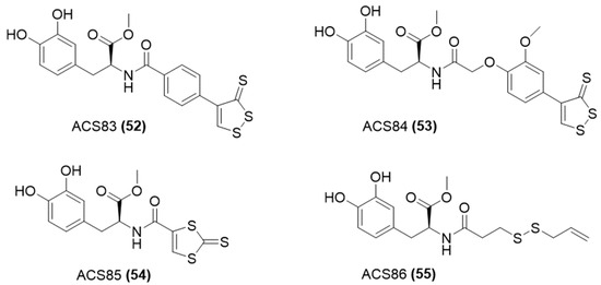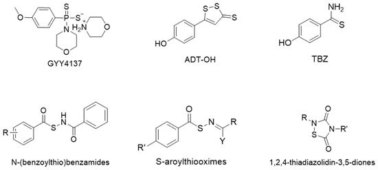 Moreover, other H2S-releasing compounds were developed and investigated, including 1,2-dithiole-3-thiones, such as 5-(4-hydroxyphenyl)-3H-1,2-dithiole-3-thione (ADT-OH) [19], arylthioamides, such as 4-hydroxythiobenzamide (TBZ) [20], N-(benzoylthio)benzamides [21], S-aroylthiooximes [22], 1,2,4-thiadiazolidin-3,5-diones [23], dithioates, such as 4-hydroxybenzodithioate (HBTA) [24], and isothiocyanates [25,26] (Figure 3).
