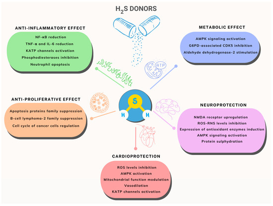 H2S donors are known to play their biological roles [27] through several mechanisms, summarized in Figure 4.