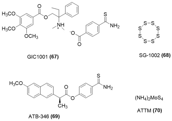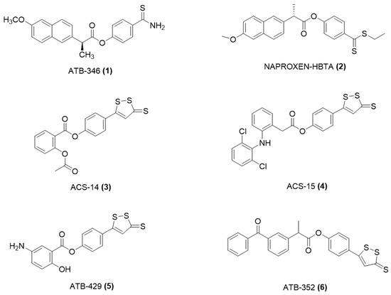 One of the most used NSAIDs, naproxen, was modified with a moiety able to release H2S, giving ATB-346 [2-(6-methoxy-napthalen-2-yl)-propionic acid 4-thiocarbamoyl-phenyl ester] (Figure 5) [40].