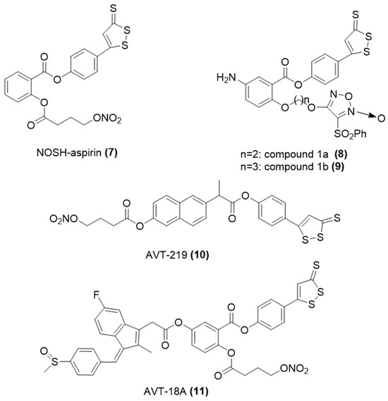 Similarly, AVT-219 and AVT-18A (Figure 6) are NOSH NSAIDs created by fusing naproxen and sulindac, respectively, with H2S and nitric oxide donors [55]. Both compounds preserved the anti-inflammatory and anti-platelet aggregation benefits of their native drugs. Moreover, they exhibited a reduced impact on the gastrointestinal tract. Additionally, these NOSH compounds demonstrated potent efficacy in suppressing the proliferation of various cancer cell types, such as colon, breast, and pancreatic cancer cells [56].