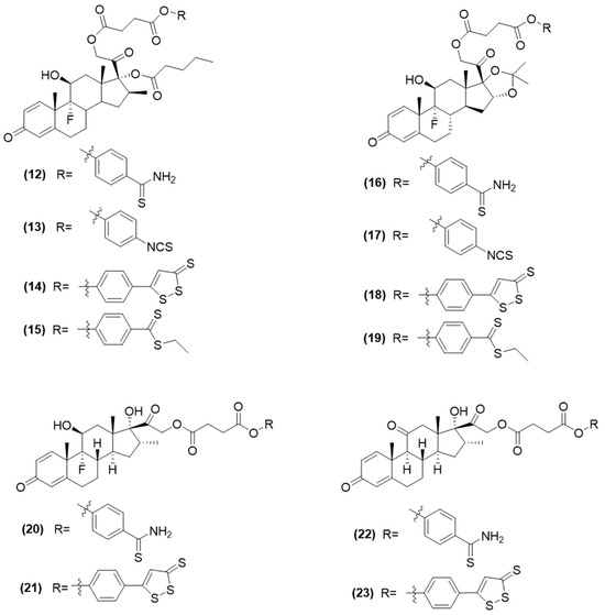 Researchers conjugated different glucocorticoids, such as betamethasone 17-valerate, triamcinolone acetonide, dexamethasone, and prednisone, to various H2S-releasing groups, like ADT-OH, thioamides, isothiocyanates, and benzodithioates, using a specific spacer (Figure 7) [62,63].