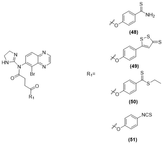 Moreover, Wang and colleagues developed a range of ATB-429 derivatives that release nitric oxide and assessed their capacity to inhibit tumor growth [54]. The findings indicated that these derivatives are potent in combating tumor cells. Specifically, compounds 8 (Figure 6) with an IC50 value of 2.677 µM, and 9 (Figure 6) with an IC50 of 3.051 µM, were more effective against the MCF-7 breast cancer cell line, and compound 8 (Figure 6) was also more effective (IC50 = 1.270 µM) against the DU145 prostate cancer cell line, compared to Vandetanib, which had IC50 values of 3.536 µM and 1.974 µM, respectively.