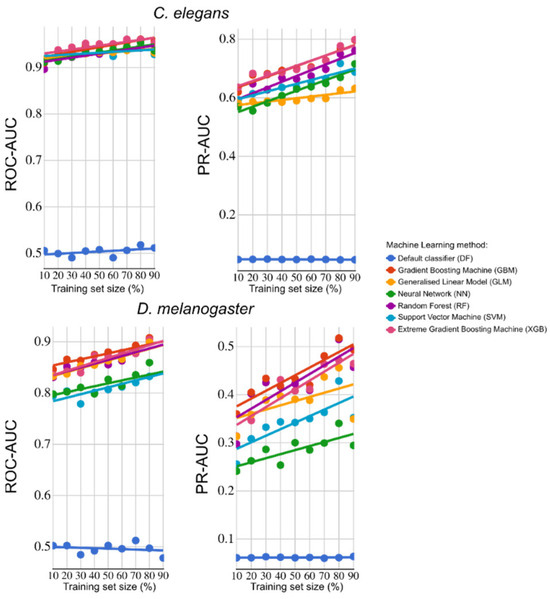 We assessed the individual and collective powers of the 27 features selected to predict essential genes in C. elegans and in D. melanogaster, employing six distinct machine learning (ML) models (Gradient Boosting Machine—GBM, Generalised Linear Model—GLM, Neural Network—NN, Random Forest—RF, Support Vector Machine—SVM, and Extreme Gradient Boosting Machine—XGB; [10,11]). The best-performing ML models for C. elegans and D. melanogaster, based on ROC-AUC and PR-AUC metrics, were used to predict essential genes in H. contortus. Then, corresponding orthologs in C. elegans, D. melanogaster, and Ovis aries (sheep host) were identified for all H. contortus genes using g:Profiler [43] or OrthoFinder [42].