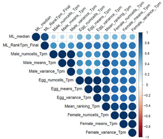 We ranked all H. contortus genes based on their probability (descending) of being essential, defined using the best-performing ML model. Moreover, using the snRNA-seq data, three rankings per sample were established for H. contortus genes according to the following criteria: (i) the number of nuclei in which a particular gene was transcribed, (i) the mean transcription, and (iii) variance of transcription among all nuclei. A final ranking was established by averaging all other rankings, defined by the snRNA and ML data. To evaluate the pairwise correlations among the defined rankings, a correlation plot (“corrplot” package for R) was produced.