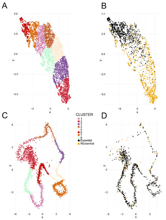 To further explore the relationship between gene essentiality and transcription in H. contortus, we identified UMAP gene clusters based on their transcription (RNA-seq) in 99 distinct samples. After filtering out genes that were not transcribed in all of these samples, 6173 genes (31.7%) remained (Figure 3A). Of these genes, 980 of 1000 (98.0%) of the high-priority essential genes were present, and most of them clustered together. On the other hand, following the filtering step, only 905 of 10,000 (9.1%) of the most likely non-essential genes remained; most of these 905 genes clustered to the exclusion of the essential genes (Figure 3B). A similar observation was made following the UMAP clustering of genes linked to female snRNA-seq data; here, we used 3000 genes with the highest average transcription levels (Figure 3C,D). In this analysis, 847 of 1000 (84.7%) essential genes remained and mostly clustered together, compared with only 118 of 10,000 (1.1%) non-essential genes that remained. To confirm the grouping of essential genes based on transcription profiles, we independently evaluated data for the related species C. elegans using its genes and respective essentiality annotations [10]. Clusters were defined using RNA-seq data from 295 samples; following the filtering step, 833 of 1000 (83.3%) essential genes were retained and mostly clustered together whereas only 1021 of 10,000 (10.2%) of the non-essential genes remained and clustered to the exclusion of essential genes.