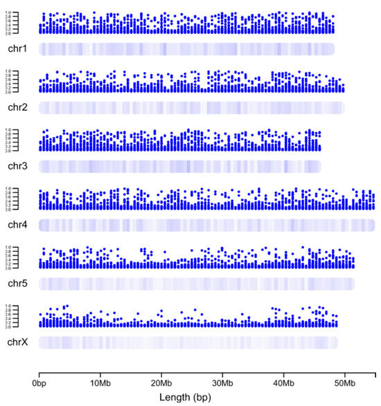 First, we first plotted the ML-based gene essentiality probabilities along individual H. contortus chromosomes (Figure 4). Most (85%) of the 499 high-priority essential genes predicted (probability of >0.7) were linked to autosomal chromosomes chr1–chr4 without a distinct clustering. A small percentage (15%) of these genes were on chr5 and the sex chromosome (chrX), and were located mainly on chromosome arms.