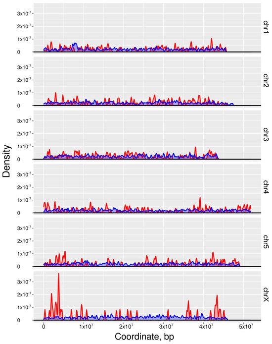 The distribution densities of both the ‘top’ 1000 genes inferred to be essential (red) as well as 10,000 non-essential (blue) genes on the autosomal (chr1-5) and sex chromosomes (chrX) of Haemonchus contortus as defined via machine learning (ML).