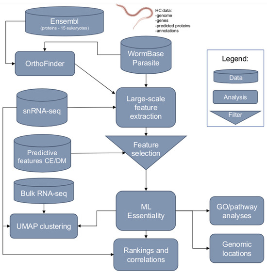The discovery of novel anthelmintic targets using conventional methods is time-consuming and challenging [8,9], and we have been promoting and evaluating the use of in silico methods for the prediction and prioritisation of ‘essential genes’ for subsequent validation as drug target candidates. Our initial exploratory studies [10,11] have been focused on assessing and employing machine learning (ML)-based approaches for the prediction of such genes in the most intensively studied multicellular model organisms—Caenorhabditis elegans (free-living nematode) and Drosophila melanogaster (vinegar fly). We have taken this focus because these organisms can be maintained in cultures in the laboratory and, importantly, because chromosome-continuous genomes and extensive functional genomic, transcriptomic, proteomic, biochemical, physiological, biological, morphological, developmental, and reproductive data sets and information are publicly available via well-curated databases including WormBase and FlyBase [12,13,14,15]. This wealth of resources has enabled deep and meaningful investigations of essential genes [16,17] for these two Ecdysozoan species. Our ML-based studies have shown that informative features can be extracted/engineered from such data sets, allowing the confident (statistically valid) prediction and prioritisation of known essential genes both within and between C. elegans and D. melanogaster (see [10,11,16,17]).
