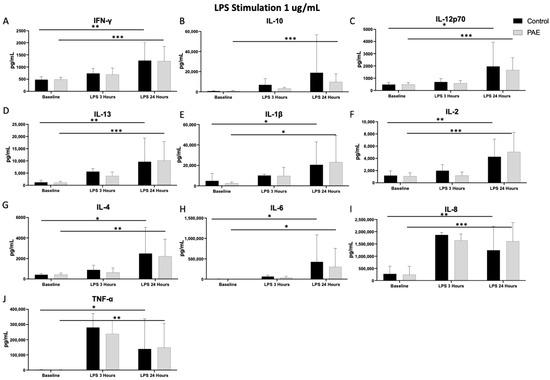 Multiple pro-inflammatory cytokines had increased levels 24 h after stimulation with LPS compared to baseline in both the control and PAE groups, including IFN-γ (45% increase in controls vs. 49% in PAE, Figure 5), IL-12p70 (49% increase in controls vs. 57% in PAE, Figure 5), IL-1β (48% increase in controls vs. 71% in PAE, Figure 5), IL-2 (52% increase in controls vs. 66% in PAE, Figure 5), IL-6 (78% increase in controls vs. 86% in PAE, Figure 5), IL-8 (67% increase in controls vs. 72% in PAE, Figure 5), and TNF-α (69% increase in controls vs. 83% in PAE, Figure 1; all p < 0.05, Figure 1 and Figure 5). Additionally, after 24 h of stimulation with LPS, both groups had a significant increase in the levels of anti-inflammatory cytokines IL-4 (58% increase in controls vs. 66% in PAE, Figure 5) and IL-13 (59% increase in controls vs. 74% in PAE, Figure 5; all p’s < 0.05, Figure 1). The findings of increased pro-inflammatory cytokine levels after stimulation with LPS are not surprising, given the preclinical literature showing that PAE can increase cytokine levels that are not observed in TLR4-deficient mice [32,33,34]. Only the PAE group had a significant increase in the 24 h after stimulation with LPS compared to the baseline in levels of the anti-inflammatory cytokine IL-10 (p < 0.001, Figure 1B).