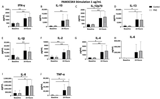 PAM3CSK4, the TLR2 agonist, did not result in significant differences between the control and PAE groups. However, TLR2 stimulation did significantly increase the levels of multiple pro-inflammatory cytokines from baseline to 24 h within groups, including IFN-γ (45% increase in controls vs. 56% in PAE, Figure 5), IL-12p70 (46% increase in controls vs. 62% in PAE, Figure 5), IL-2 (57% increase in controls vs. 68% in PAE, Figure 5), IL-8 (78% increase in controls vs. 72% in PAE, Figure 5), and TNF-α (69% increase in controls vs. 84% in PAE, Figure 5) in both groups (all p’s < 0.05, Figure 2). There was a significant increase only in the level of IL-1β in the PAE group (p < 0.01, Figure 2E) following TLR2 stimulation.TLR2 is embedded in the cell membrane, similar to TLR4, and activation can lead to the release of inflammatory cytokines, specifically IL-1β [35], as observed in this study. The levels of anti-inflammatory cytokines were also significantly increased in both groups, including increased levels of IL-13 (62% increase in controls vs. 75% in PAE, Figure 5) and IL-4 (46% increase in controls vs. 71% in PAE, Figure 5; all p’s < 0.05, Figure 2). Only the PAE group had increased levels of the anti-inflammatory cytokine IL-10 (p < 0.01, Figure 2B) following TLR2 stimulation.