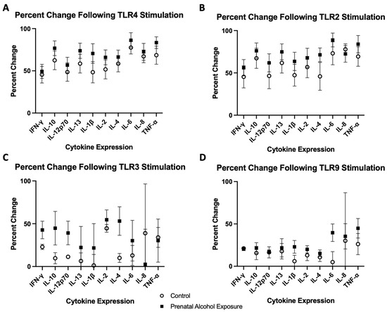 Descriptive statistics were used to summarize continuous (t-test and Mann–Whitney test) and categorical (Chi-square and Fisher’s exact) maternal and infant characteristics and compare them among PAE and control study groups. Baseline measurements of cytokine levels in the control and PAE study groups were completed using Student’s t-test. The cytokine level was then assessed as a percent change from the baseline, which was calculated by taking the stimulated level measurement minus the baseline level, then dividing by the stimulated measurement and multiplying by 100. The percent change of cytokine levels was compared between the study groups using Student’s t-test for each individual cytokine; the representative figures for percent change are provided in Figure 1. The time comparison of cytokine levels following TLR4 stimulation was analyzed using a two-way analysis of variance (ANOVA) to assess differences between the groups (control vs. PAE) and across the time course (the baseline, 3 h, 24 h) following TLR4 stimulation. Post-hoc pairwise comparisons were conducted with the Tukey adjustment. In all analyses, statistical significance was defined at an alpha level of p < 0.05.
