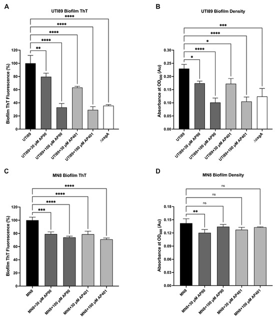 Both α-sheet peptides inhibited amyloid formation as indicated by reduced ThT fluorescence. Biofilm ThT fluorescence values are reported as percent of the average UTI89 or MN8 peptide-free control fluorescence. For UTI89 (A), 100 µM AP401 caused the greatest reduction in fluorescence of 70% as compared to the UTI89 control (p < 0.0001). Reductions in biofilm formation as quantified by biofilm density measurements (OD600) were also observed for both peptides and bacteria. For UTI89 (B), 100 µM AP90 and AP401 reduced biofilm formation to the level of the control UTI89 ∆csgA strain. For ThT fluorescence for MN8 (C), the 100 µM AP401 condition caused the greatest reduction of 29% as compared to the MN8 control (p < 0.0001). For MN8 biofilm density (D), the 30 µM AP90 condition significantly reduced biofilm formation. All values are mean and standard deviation for three replicates. Values are mean ± SD or error for three replicates and p-values are indicated as follows: ns = not significant; * p < 0.05; ** p < 0.01, *** p < 0.001, **** p < 0.0001.