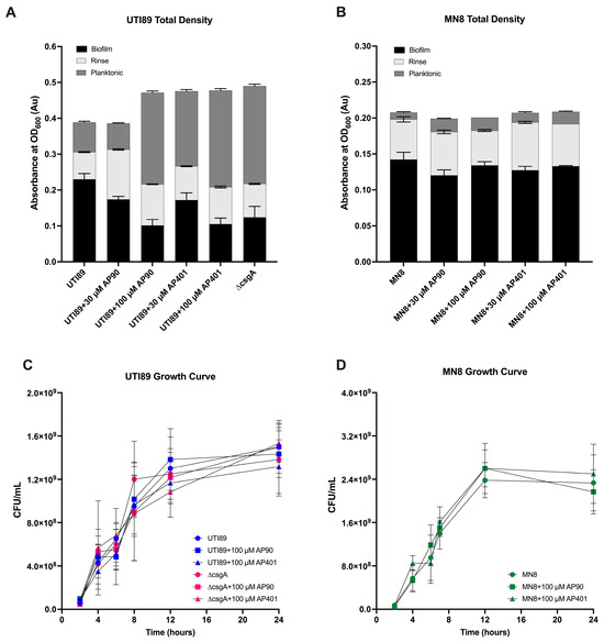 Varied efficacy by the two peptides as well as a concentration-dependent response was observed for both bacterial strains. The density of cells in the planktonic state and in the PBS rinse were also quantified with OD measurements (Figure 2A,B). As shown in Figure 1B,D, the addition of the peptides caused a reduction in biofilm mass. Concomitantly, the addition of the peptides caused an increase in the planktonic cell density such that the total density did not decrease, as previously shown for UTI89 [10]. Next, the addition of the peptides did not cause a reduction in the total cell density for the UTI89 ∆csgA control (Supplementary Figure S1B). Finally, UTI89 and MN8 growth curves were performed with growth measured by CFUs in the presence of peptide (Figure 2C,D). The peptides did not affect the growth rates of UTI89, UTI89 ∆csgA, or MN8 in the presence of 100 µM AP90 or AP401 as compared to cells grown in an equal volume of water. This indicates that the peptides did not affect the growth of the cells, only the formation of the mature amyloid.
