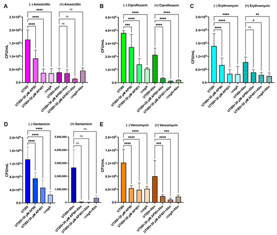 Both synthetic α-sheet peptides inhibited biofilm formation for the non-antibiotic and antibiotic conditions for the E. coli strain UTI89. Biofilm formation was quantified as CFU/mL for UTI89 biofilms without (plain bars) and with antibiotics (striped bars) after 48 h. Antibiotics at 300 µg/mL were added after 42 h of growth and biofilm formation was measured for (A) gentamicin, (B) ciprofloxacin, (C) vancomycin, (D) amoxicillin, and (E) erythromycin. Values are mean ± SD or error for three replicates and p-values are indicated as follows: ns = not significant; * p < 0.05; ** p < 0.01, *** p < 0.001, **** p < 0.0001. There is not a statistically significant reduction in CFUs between the peptide conditions and the ∆csgA control for all non-antibiotic and antibiotic conditions.
