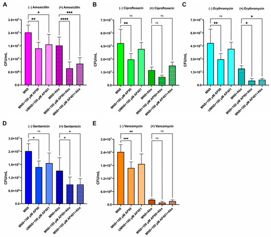 The α-sheet peptides inhibited S. aureus biofilm formation for the non-antibiotic and antibiotic conditions to varying extents. Biofilm formation was quantified as CFU/mL for MN8 biofilms without (plain bars) and with antibiotics (striped bars) after 24 h of growth. Antibiotics at 300 µg/mL were added after 18 h of growth and biofilm formation was measured for (A) vancomycin, (B) erythromycin, (C) ciprofloxacin, (D) amoxicillin, and (E) gentamicin. Values are mean ± SD or error for three replicates and p-values are indicated as follows: ns = not significant; * p < 0.05; ** p < 0.01, *** p < 0.001, **** p < 0.0001.