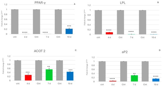 Expression of adipogenic genes: The expression of PPAR-γ (A), LPL (B), ACOT 2 (C), and aP2 (D) was evaluated in hADSCs cultured in the presence of 4d-MCF-7-E.M (4 d: red bars), 7d-MCF-7-E.M (7 d: green bars), or 10d-MCF-7-E.M (10 d: blue bars). The mRNA levels for each gene were normalised to glyceraldehyde-3-phosphate-dehydrogenase (GAPDH) and expressed as the fold change (2−ΔΔCt) of the mRNA levels observed in untreated control hADSCs (Ctrl: grey bars), defined as 1 (mean ± SD; n = 6). Data are expressed as the mean ± SD relative to the control (** p ≤ 0.01), (*** p ≤ 0.001), (**** p ≤ 0.0001).