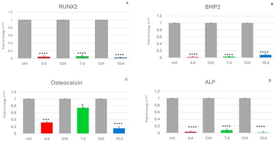 Expression of osteogenic genes: The expression of RUNX2 (A), BMP2 (B), osteocalcin (C), and ALP (D) was evaluated in hADSCs cultured in the presence of 4d-MCF-7-E.M (4 d: red bars), 7d-MCF-7-E.M (7 d: green bars), or 10d-MCF-7-E.M (10 d: blue bars). The mRNA levels for each gene were normalised to glyceraldehyde-3-phosphate-dehydrogenase (GAPDH) and expressed as the fold change (2−ΔΔCt) of the mRNA levels observed in untreated control hADSCs (Ctrl: grey bars), defined as 1 (mean ± SD; n = 6). Data are expressed as the mean ± SD relative to the control (* p ≤ 0.05), (*** p ≤ 0.001), (**** p ≤ 0.0001).