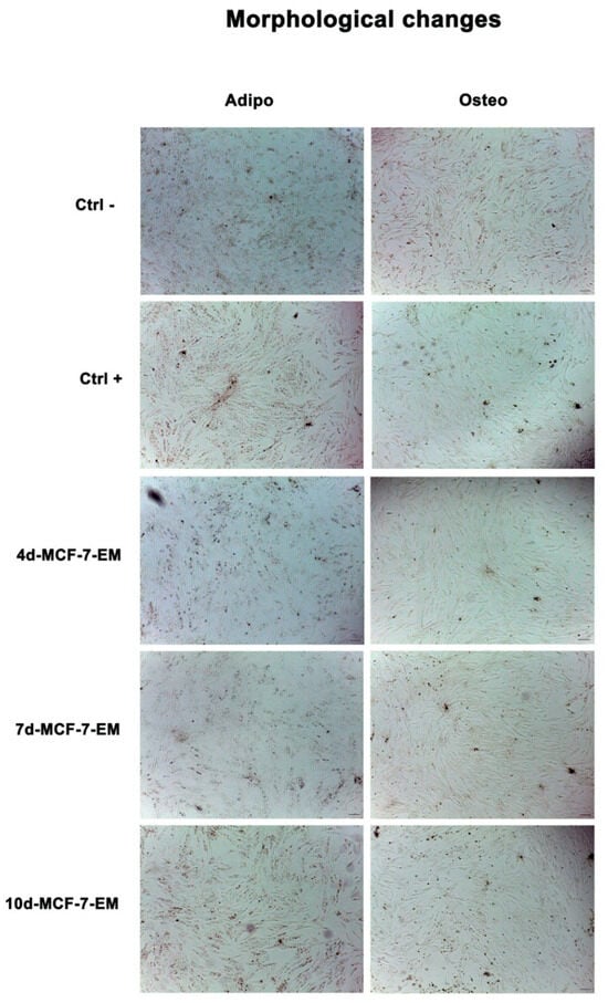 Optical microscope analysis of ADSC morphology after exposure to MCF-7-E.M figure shows morphological changes in cells exposed to 4d-, 7d-, or 10d-MCF-7-E.M after 7 days in culture, as compared to untreated control cells (Ctrl). Ctrl+ represents cells exposed to the differentiation medium alone. Scale bar = 100 µm.