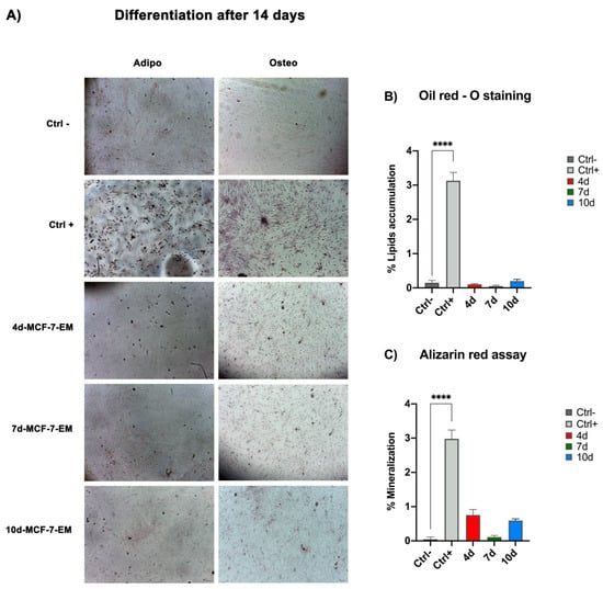 Effects of MCF-7-E.M in ADSCs during adipogenic and osteogenic differentiation: (A) Lipid and calcium accumulation, after 14 days of treatment, in ADSCs exposed to 4d-MCF-7-E.M (4 d: red bars), 7d-MCF-7-EM (7 d: green bars), or 10d-MCF-7-EM (10 d: blue bars). Positive controls (CTRL+: light grey bars) are ADSCs cultured in adipogenic or osteogenic conditioned medium. Scale bar = 100 μm. The percentage of lipid accumulation (B) or mineralisation (C) was calculated using ImageJ. Data are expressed as the mean ± SD and are representative of 6 different experiments. An average was made from three technical replicates (**** p ≤ 0.0001).